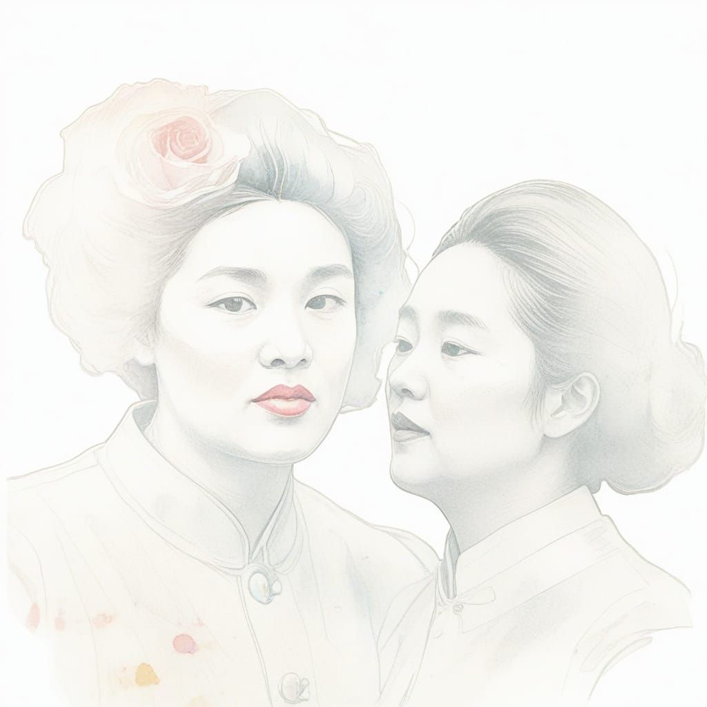 This image depicts a surreal scene of a woman dancing with President Mao, whispering secrets. Ethereal polaroids float around them in a soft-focus, muted color palette, evoking a nostalgic, playful mood.