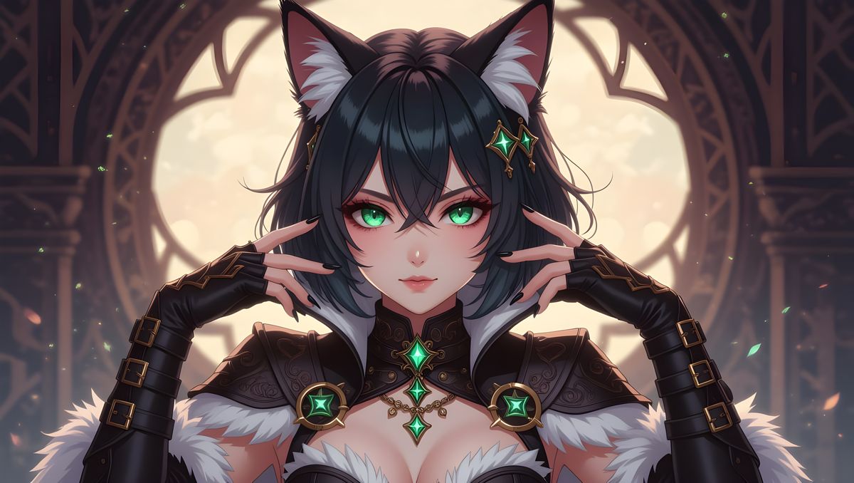 This image features a detailed anime-style portrait of a catgirl with vibrant, ethereal green eyes, set against a dreamy background, showcasing a fusion of fantasy and digital illustration techniques.