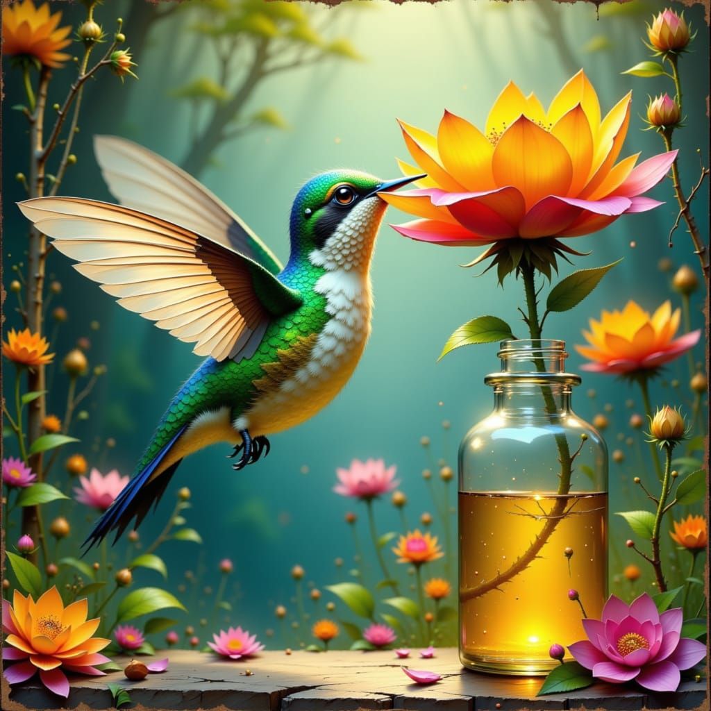 A vivid image showing a hummingbird drinking nectar from a flower growing out of a glass bottle. The bird's feathers are lace-like, and the scene is bathed in soft sunlight in a whimsical style.