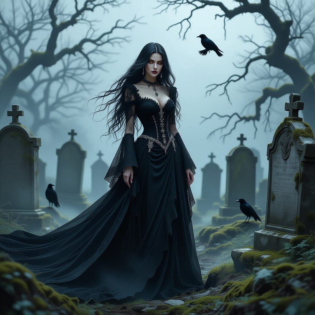This image shows a gothic woman in a long black gown standing in a misty graveyard. Ravens surround her as her eyes glow with ethereal light. The image is rendered with dramatic chiaroscuro lighting.