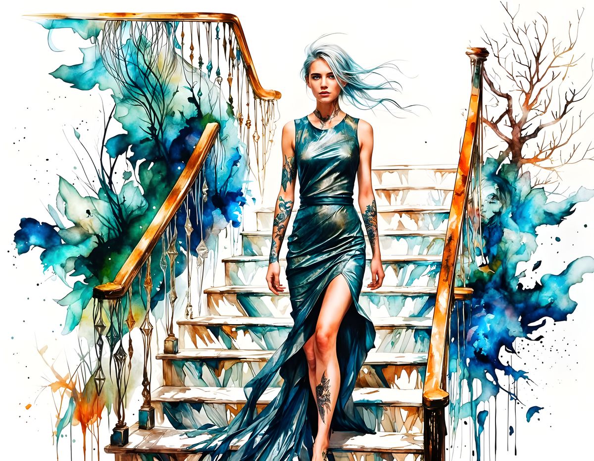 A striking picture of a tall woman with emerald eyes and white hair, adorned with glowing bioluminescent tattoos, standing in a minimalist white space. The image blends ethereal and delicate watercolor techniques.