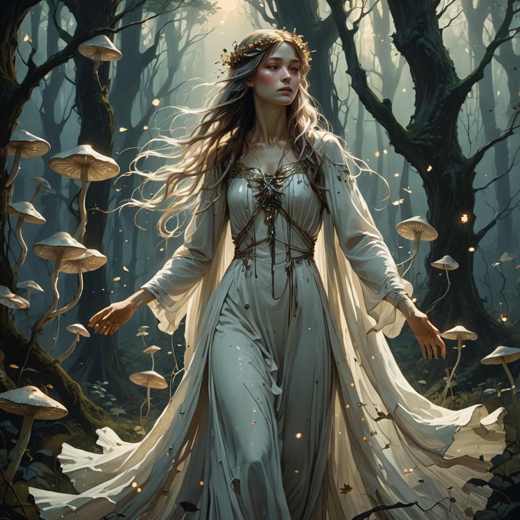 A medium shot of a woman's spirit in a forest. This image showcases a gothic art nouveau style with a muted palette, glowing mushrooms, and fireflies, reminiscent of a cinematic dark fantasy scene.