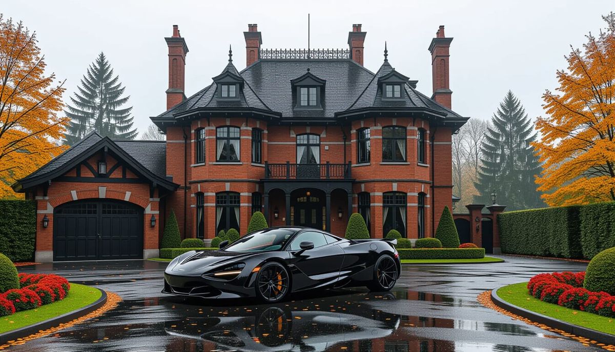 This image features a grand Victorian chateau and a black McLaren 720S parked amidst vibrant autumn foliage under a cloudy, rainy sky. It captures a cool, misty atmosphere with rich textures and visible brushwork.