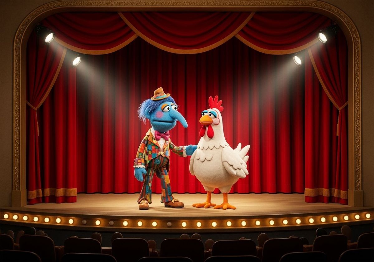 A whimsical theatrical scene inspired by 1970s variety shows, featuring a flamboyant blue puppet and his calm chicken companion on a classic stage with red velvet curtains and spotlights. Captures an unconventional romance with visible puppetry textures.