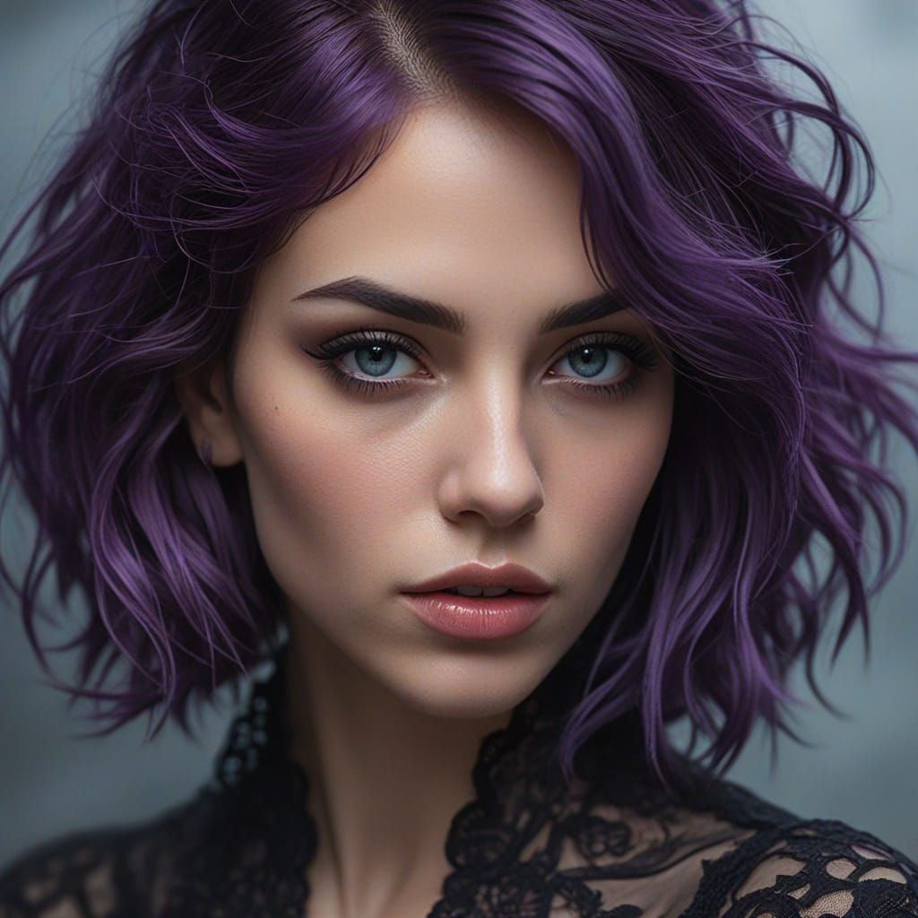 A vibrant oil painting of a purple-haired supermodel in black lace lingerie emerging from fog. The close-up shot features glossy lips, detailed eyelashes, and a moody, misty atmosphere in deep blues and purples.