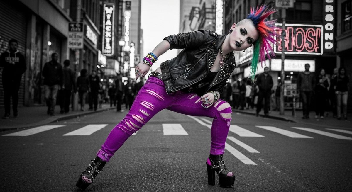 This image shows a punk gyaru girl in a high-contrast, black and white street scene. She has a bold mohawk, ripped jeans, a studded leather jacket, and platform shoes. The background features street art and neon signs.