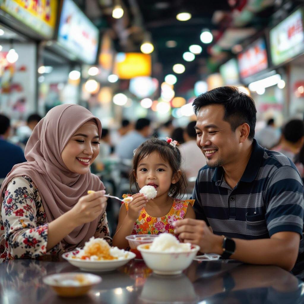 This image shows a young Malay girl enjoying ice kacang with her parents at a busy hawker centre. The picture employs a bokeh style with a shallow depth of field.