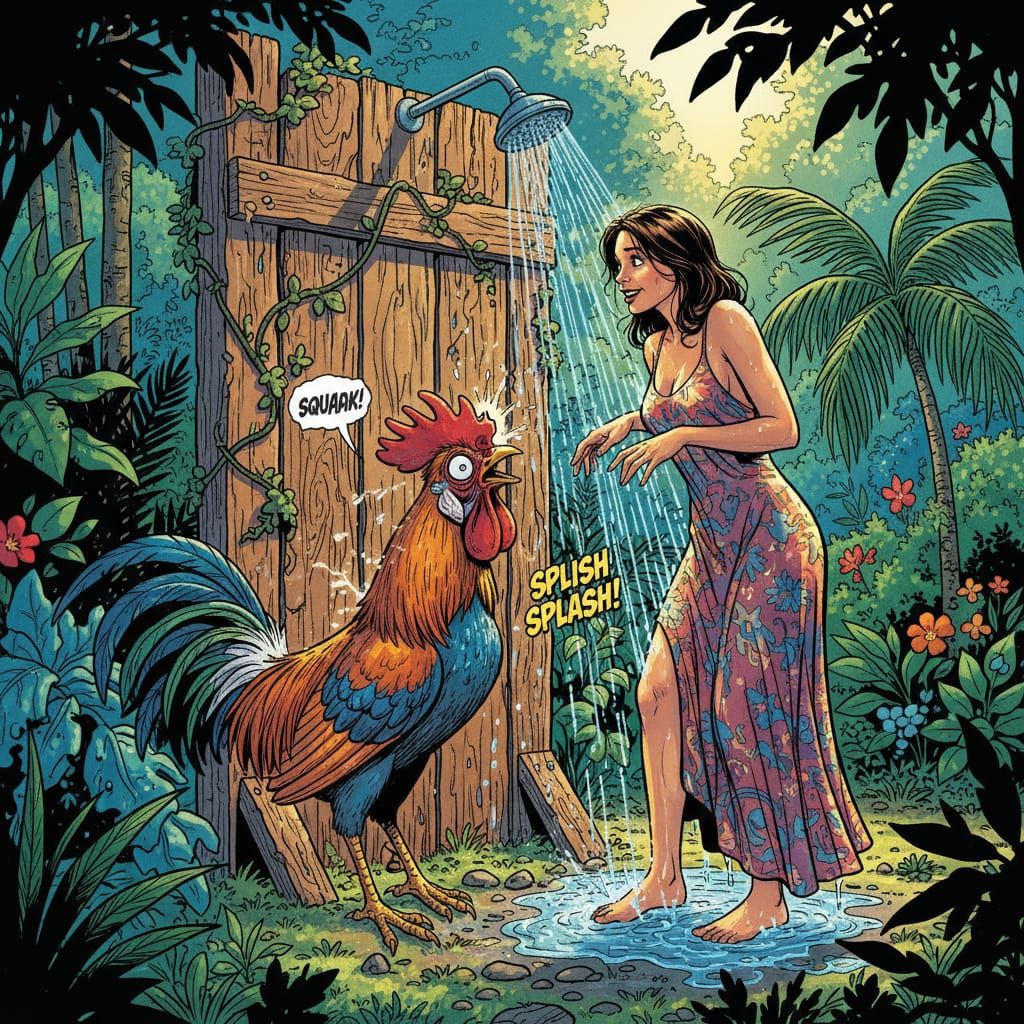 This image shows a frightened rooster observing a woman in a wooden shower amidst lush greenery, captured in a vivid comic book art style.