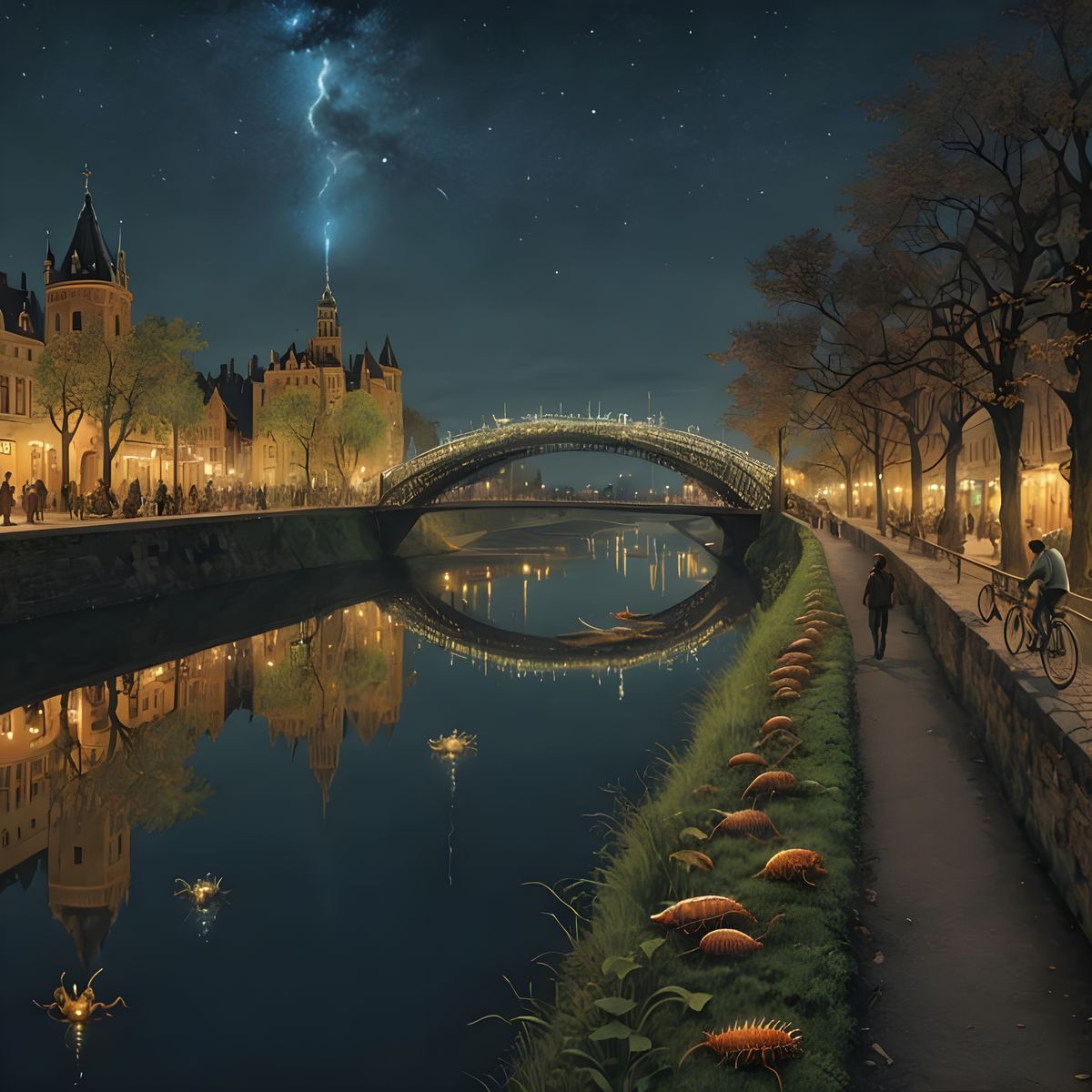 A surreal scene by a riverbank with illuminated centipedes and bicycles moving erratically. Space debris floats by in this intricately detailed and whimsical magical realist artwork.
