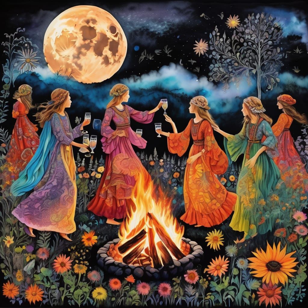 A vibrant scene of women in floral dresses dancing around a bonfire under a full moon. The image features a kaleidoscopic, misty atmosphere with alcohol ink textures.
