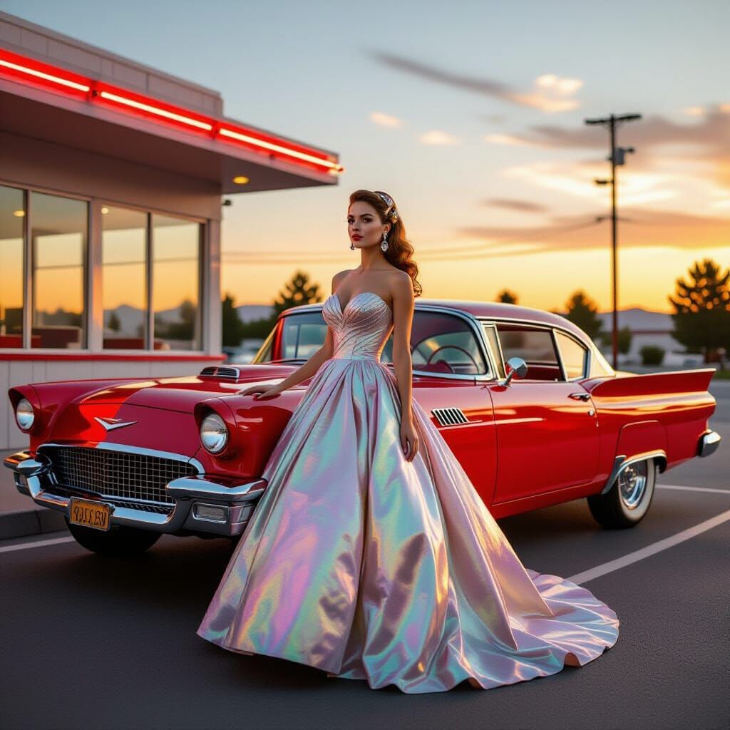 A striking image of a woman in a 1950s haute couture gown next to a cherry-red muscle car at sunset. Captured in a retro diner parking lot, this photo boasts ultra-high resolution and a warm golden hour light.