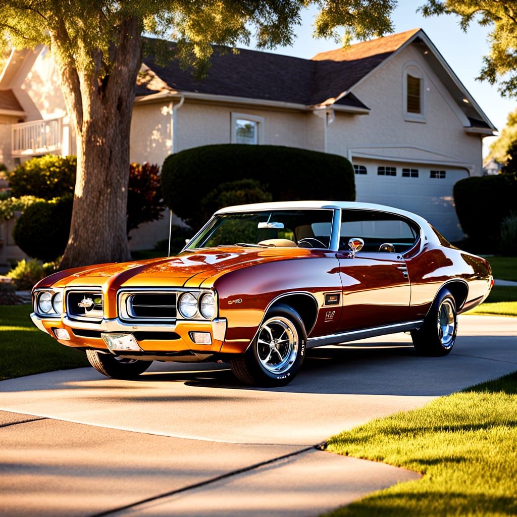 This image shows a 1969 Pontiac GTO parked in a driveway. The classic car features glossy paint reflections and shining chrome accents, illuminated by warm morning sunlight in a professional automotive photograph.