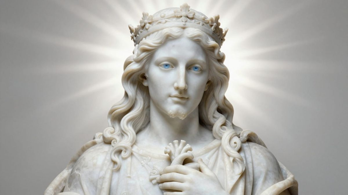 A stunning white marble sculpture of Lord Jesus, depicted as a young man with intense blue eyes and a gentle smile, radiating an ethereal glow. This Renaissance-style religious art captures his majesty.