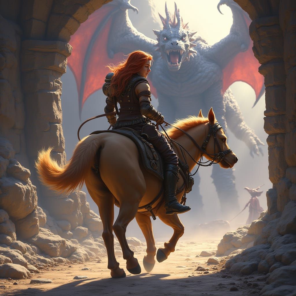 This image shows a gnome artificer with copper hair riding a mastiff through a dungeon. A dragon sleeps in the background, all rendered with dynamic lighting and hyperdetailed textures in a dark fantasy style.