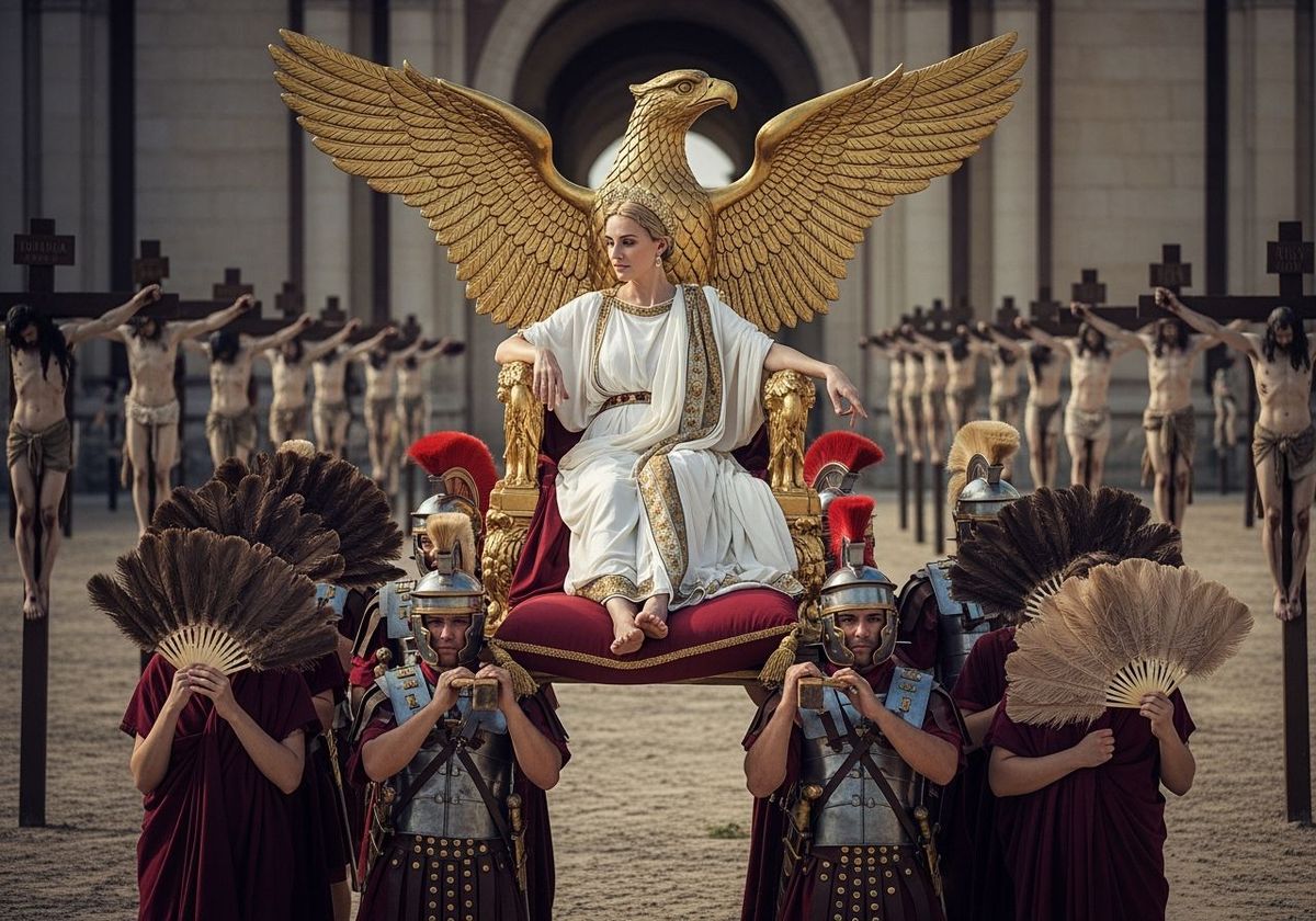 This image shows a Roman Empress being carried on a golden throne by soldiers. Servants with fans attend her, while crucified peasants line the background, all captured with natural lighting and shallow depth of field.