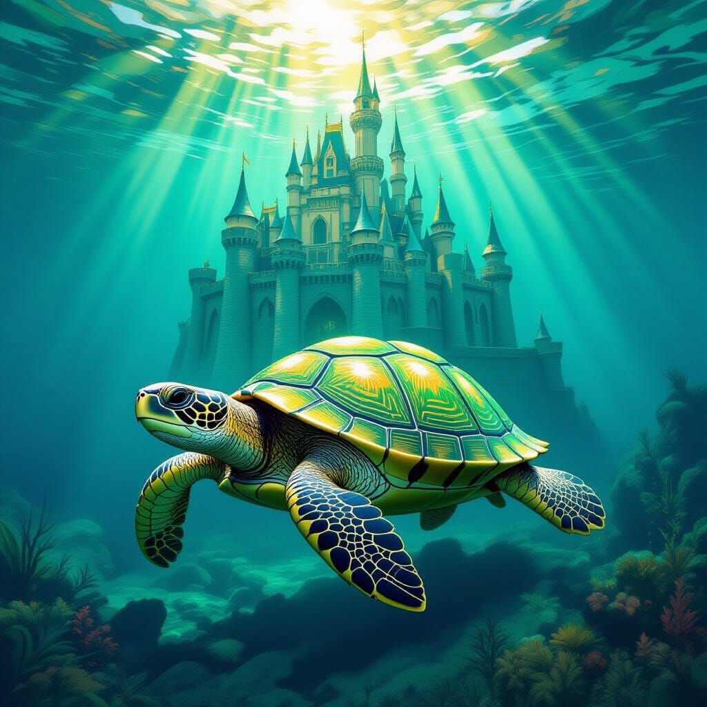 This image depicts an ancient castle beneath a clear lake, with a large turtle featuring a shell of green, brown, yellow, and gold. Sunlight creates a magical, dreamlike atmosphere in a fantastical realism style.