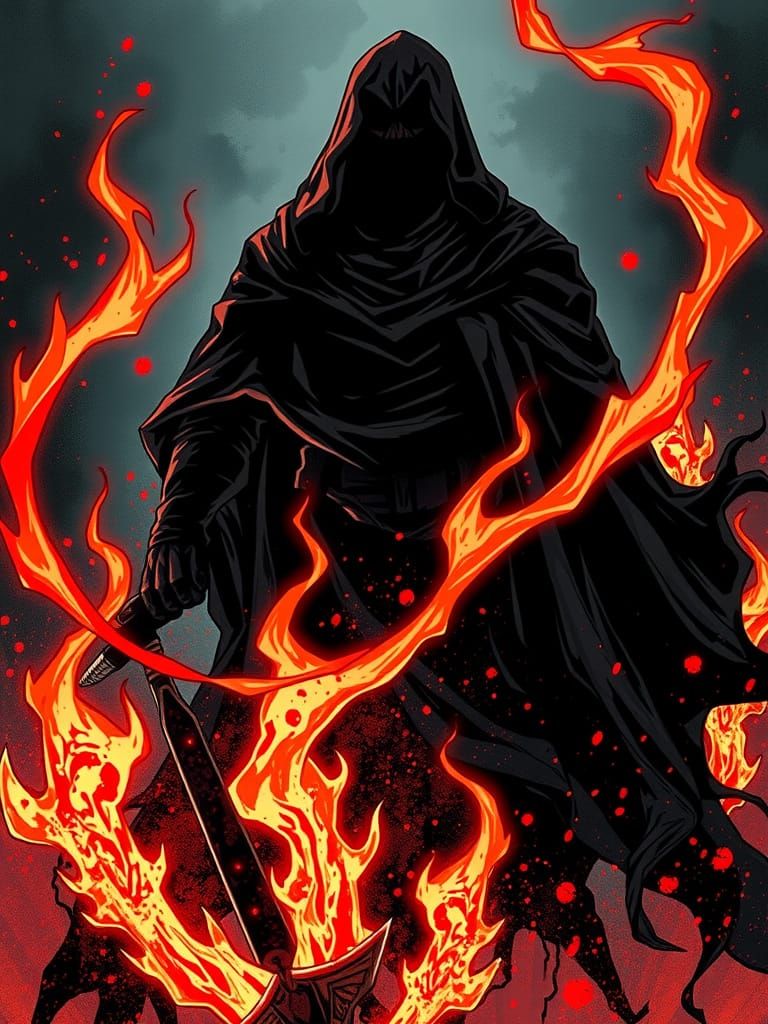 This image shows a shadowy, sword-wielding figure engulfed in eerie flames, rendered in a haunting anime style. The artwork features dramatic lighting and dynamic poses.