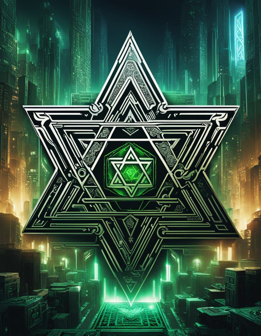 A digital artwork of the Israeli superhero HaTzefa standing in Tel Aviv. Her black suit has glowing green snake patterns and a metallic emblem. The background shows a dramatic cityscape at night in a science fiction style.