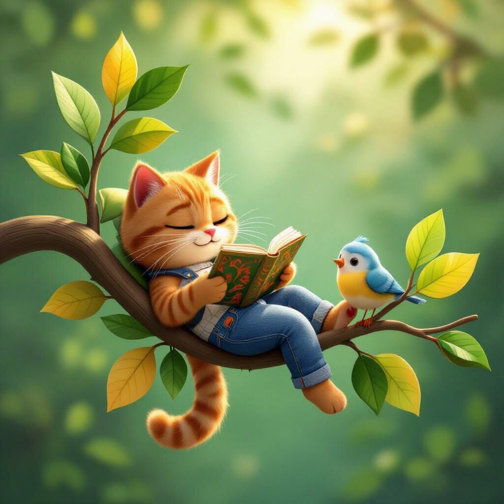 This image shows a ginger cat in jeans lounging on a rainbow-shaped branch, reading a book. A bird perches nearby. Rendered in a vibrant, cartoon-style 3D with cinematic lighting.