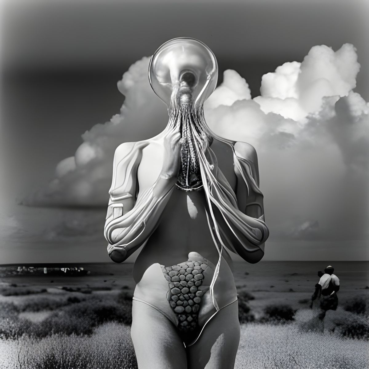 This image shows an alien biomechanical squid form floating among clouds. The hyperrealistic image features translucent textures, complex details and reflective surfaces.