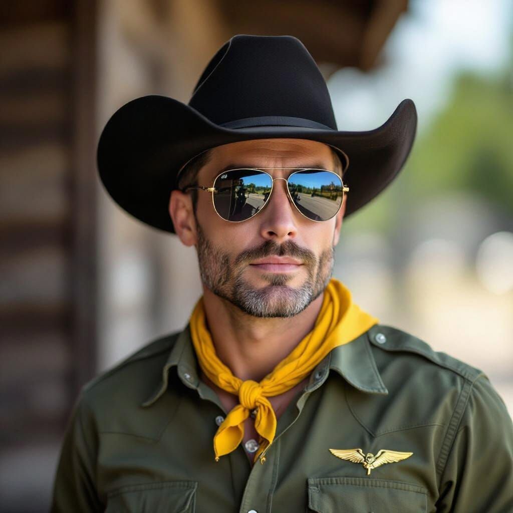 A striking image of a handsome man in a cowboy hat and military shirt, holding a machine gun and camera. Rendered in a bold comic book style with dramatic lighting.