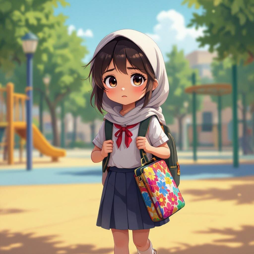 A young Arab girl hesitantly picks up a lost wallet on a school playground. Rendered in a detailed 3D anime style with cinematic flair and glowing accents.