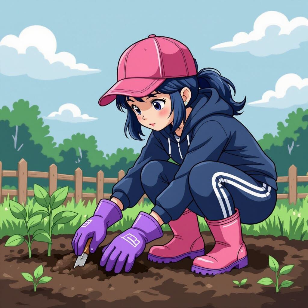 A charming cartoon girl with colorful hair tends her garden on a cloudy day. The image evokes a Studio Ghibli aesthetic with vibrant colors and meticulous details.