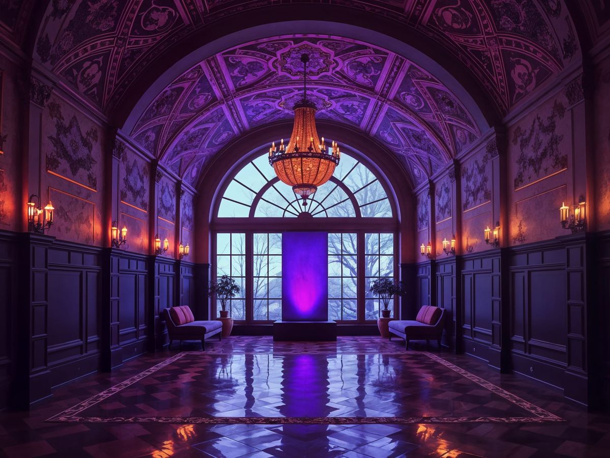 This image showcases a surreal, opulent atrium rendered entirely in shades of purple. The visual interference style creates an evolving, dreamlike atmosphere.