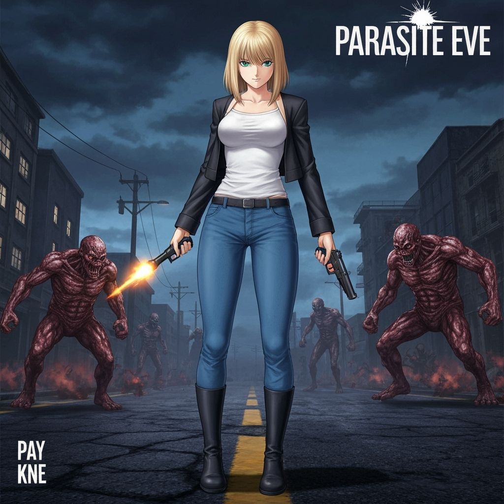 This image shows an anime-style woman with blonde hair and teal eyes, resembling Aya Brea from Parasite Eve, holding a handgun in an action scene. Mutated monsters appear in the background under a dark sky.