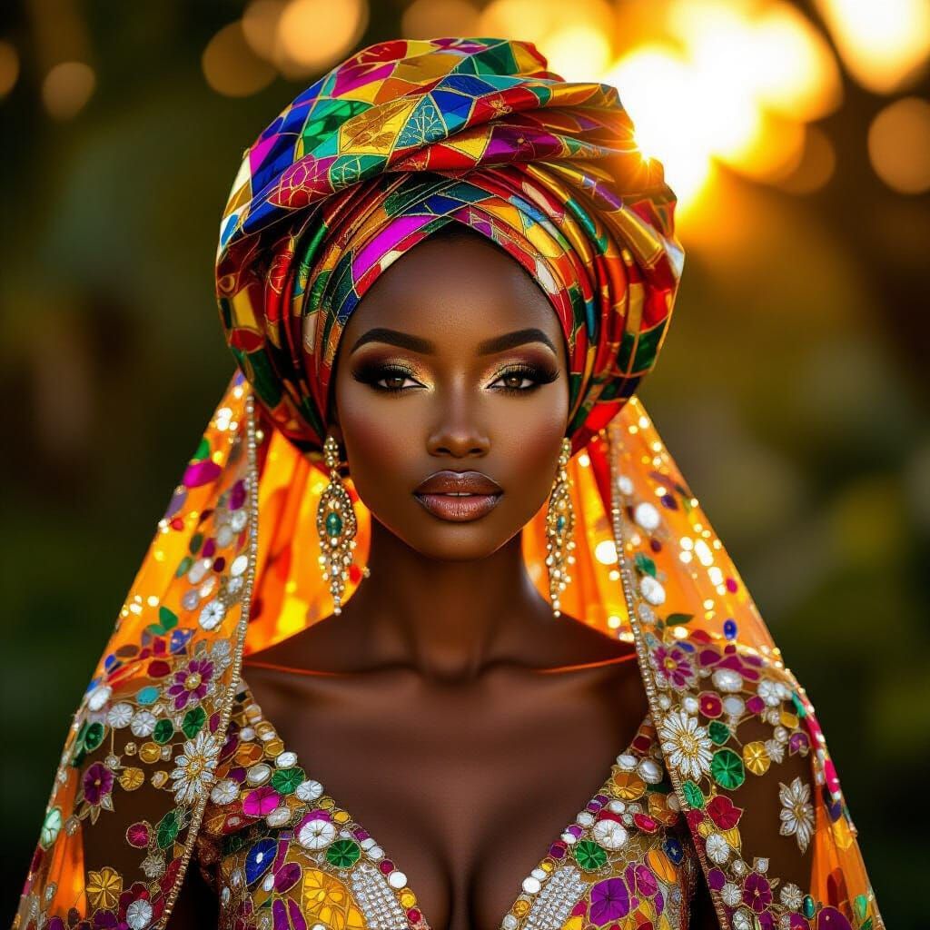 A photorealistic portrait of a beautiful Nigerian woman adorned in a glass headwrap and flowing gown. Golden hour light highlights the intricate glasswork in rich cultural colors, captured with a shallow depth of field.