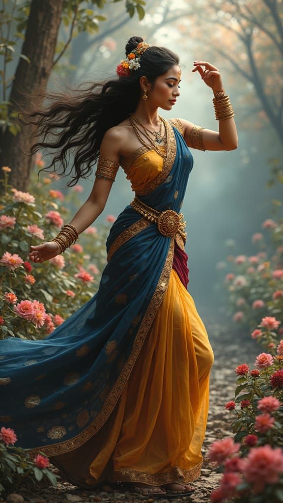A beautiful nymph in a graceful dance. She wears a traditional saree with gold, blue, and maroon hues, set in a mystical garden with blooming flowers and soft lighting, in an art nouveau style.