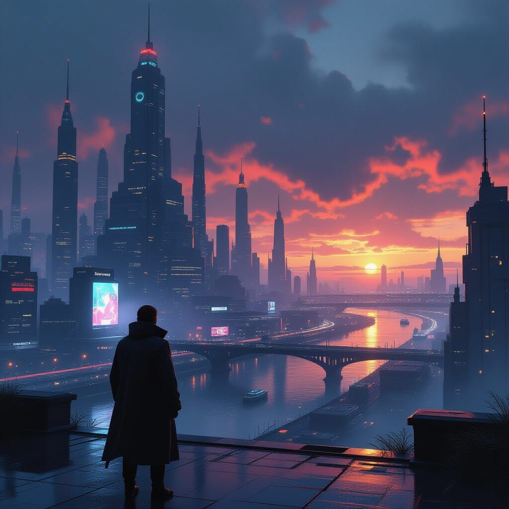 This image showcases an epic, cinematic digital matte painting filled with intricate details and dramatic lighting. It features a maximalist composition with meticulous textures, evoking a futuristic cyberpunk atmosphere.