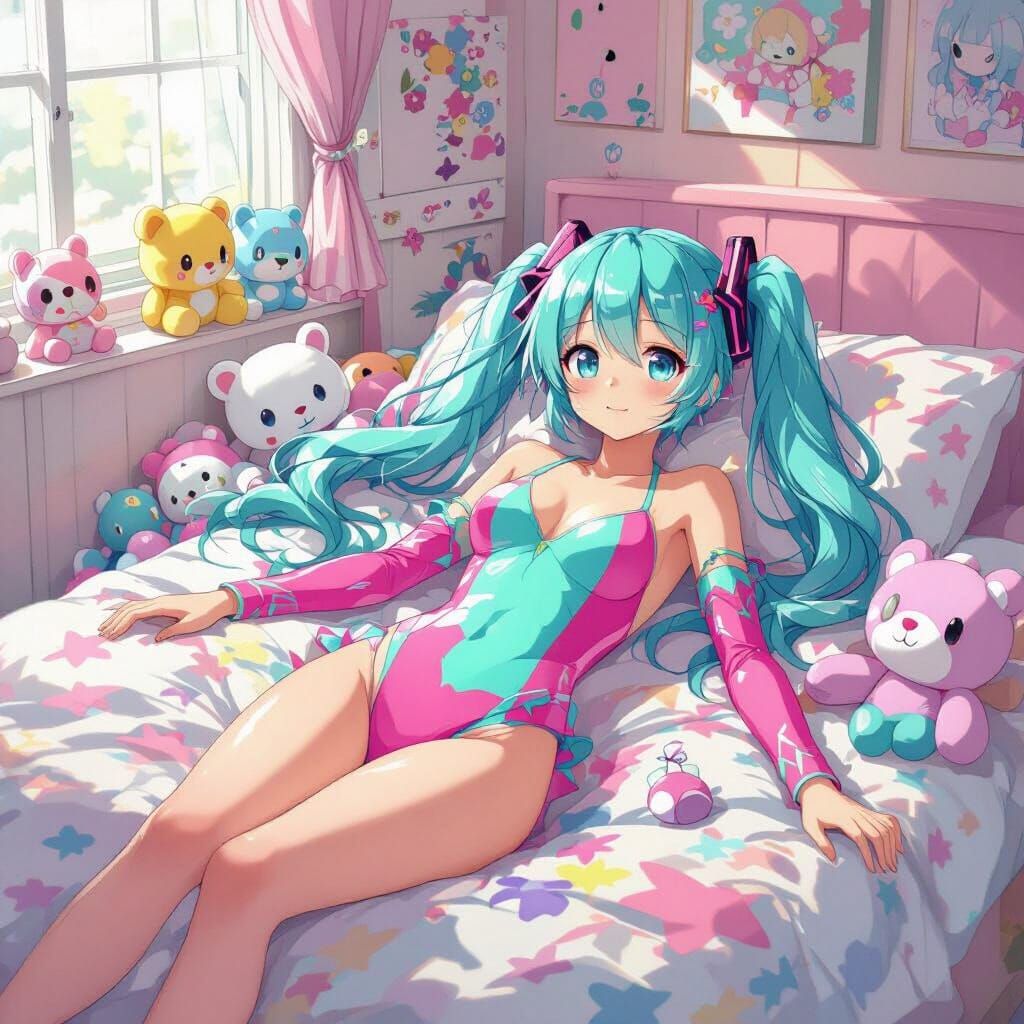 This image shows Hatsune Miku in a bright swimsuit, surrounded by plush toys in a pastel bedroom. The artwork has a digital painting aesthetic with anime-style influences.