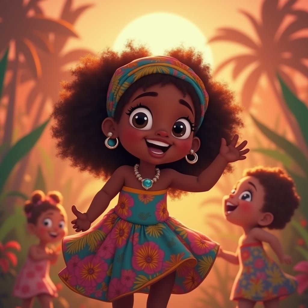 This image showcases a joyful Black child dancing with friends in a lush Caribbean setting. The stylized animation evokes a playful, energetic aesthetic with vibrant colors and textures.