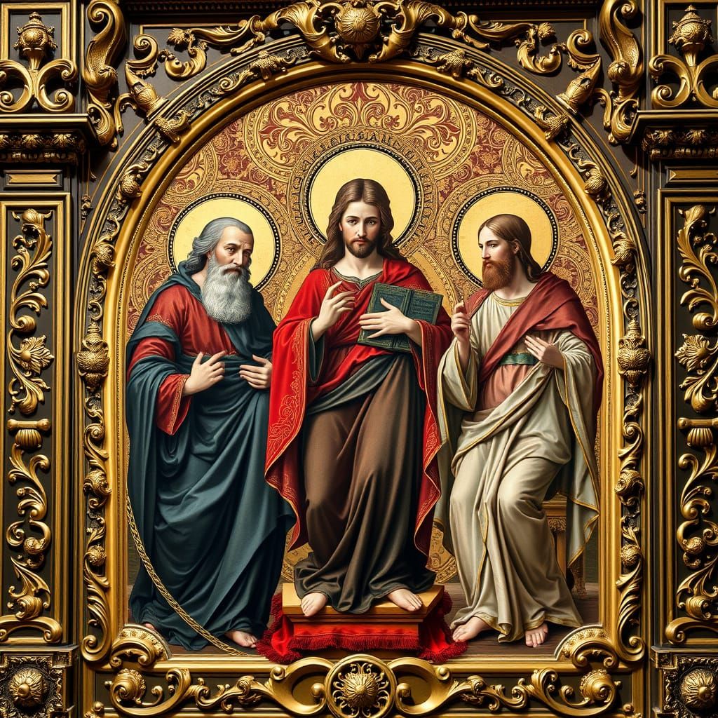 A classical image of the Holy Trinity in an ornate setting. The artwork evokes Renaissance art with golden accents and intricate details in the style of old masters.