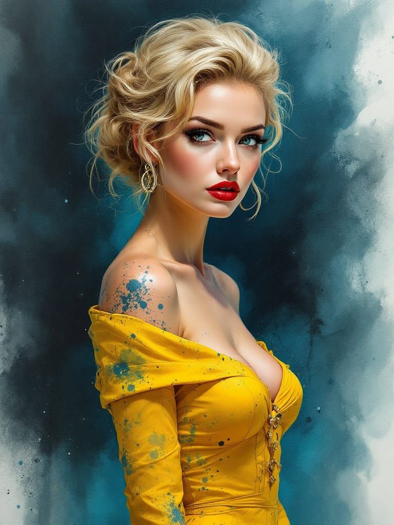 This image shows a 1950s pin-up woman in a yellow dress, rendered with fluid ink splatter and watercolor textures. It features dramatic lighting and smoky blue accents.