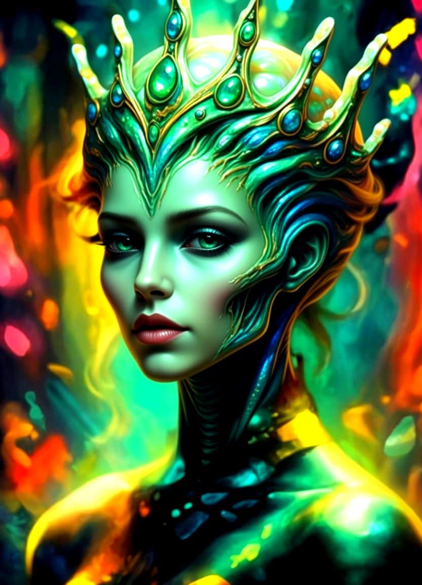 A realistic 3D render of a beautiful alien princess with a shimmering, pearlescent tiara fused into her skull. Features intricate detail and a fantastical, futuristic design.