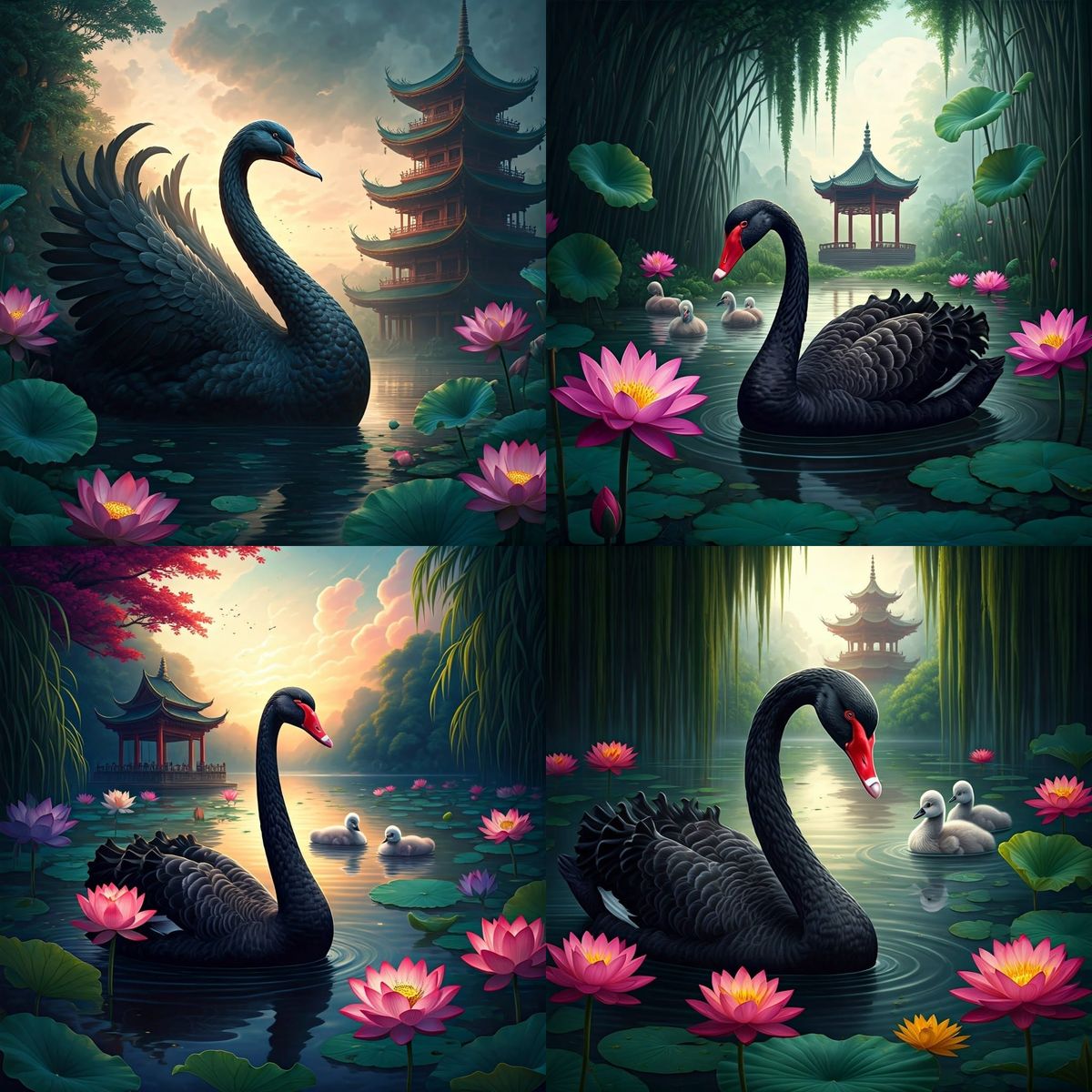 This image shows a black swan swimming among multicolored lotus flowers, its cygnets in the distance, and a pretty pagoda. The artwork is hyperrealistic with dramatic color depth.
