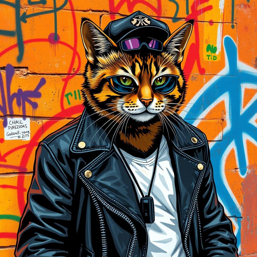 This image shows a cat sporting a retro 70s look with a leather jacket and walkman, standing before a graffiti wall. The artwork is reminiscent of stylized digital art, featuring bold colors and detailed textures.