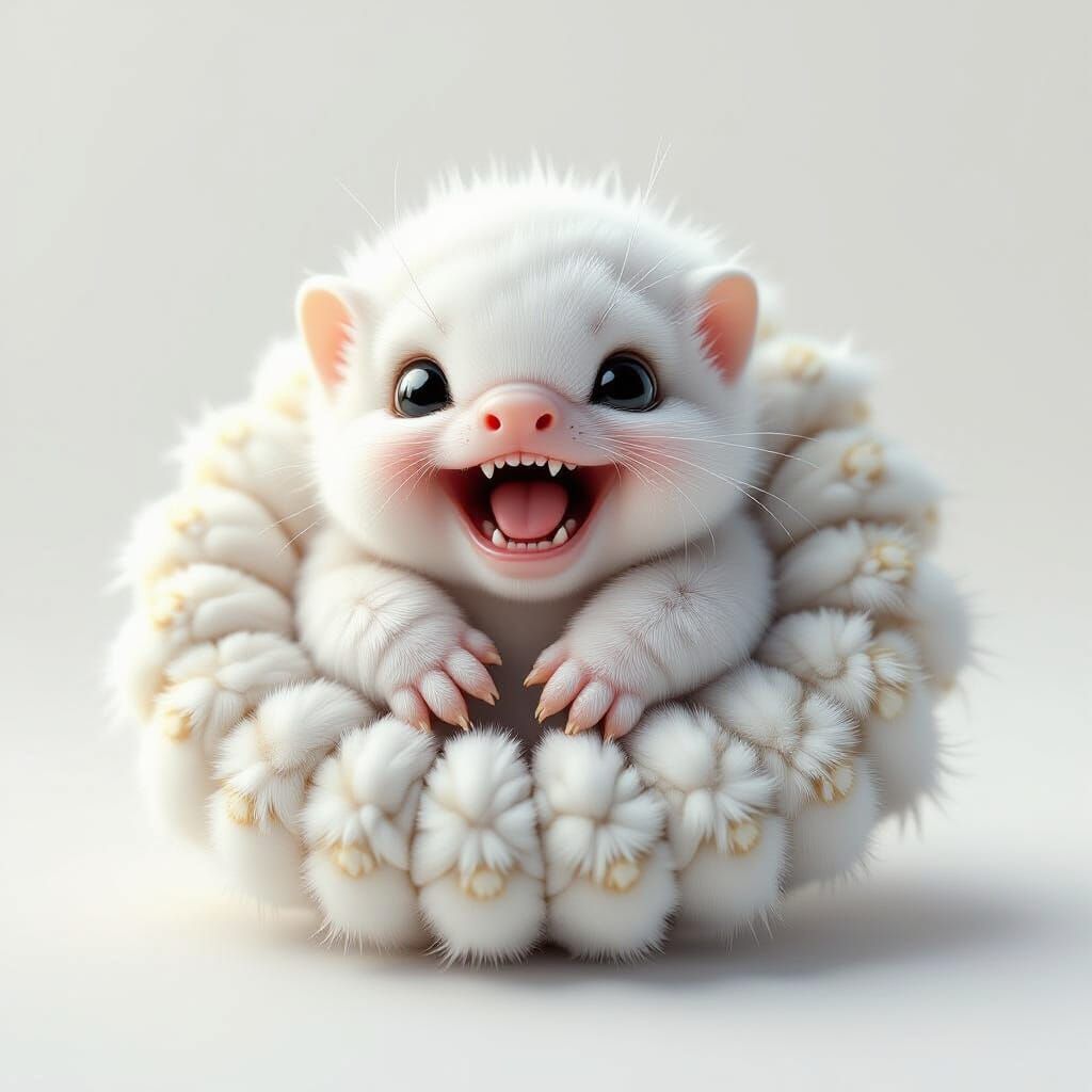A white-silver caterpillar baby lies curled up in a round ball position on a soft white background. The baby's large are bright and prominent on its furry face, which displays an open-mouthed expression showing its teeth in a laughing pose. The baby's thick, coat features detailed fur textures and markings ...