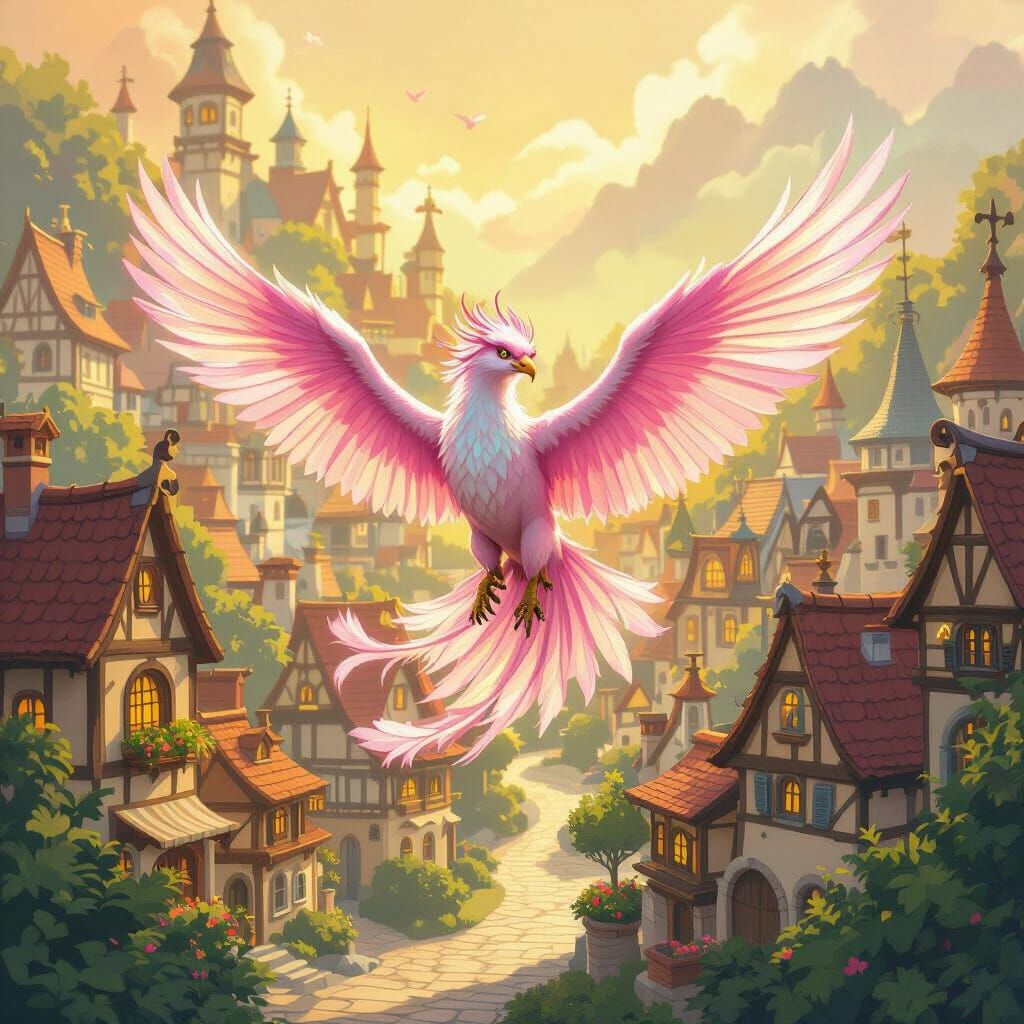 This image shows a pink griffin soaring over a whimsical village. The griffin has iridescent feathers and glowing wings. The buildings are designed in a fantastical style, bathed in warm light.