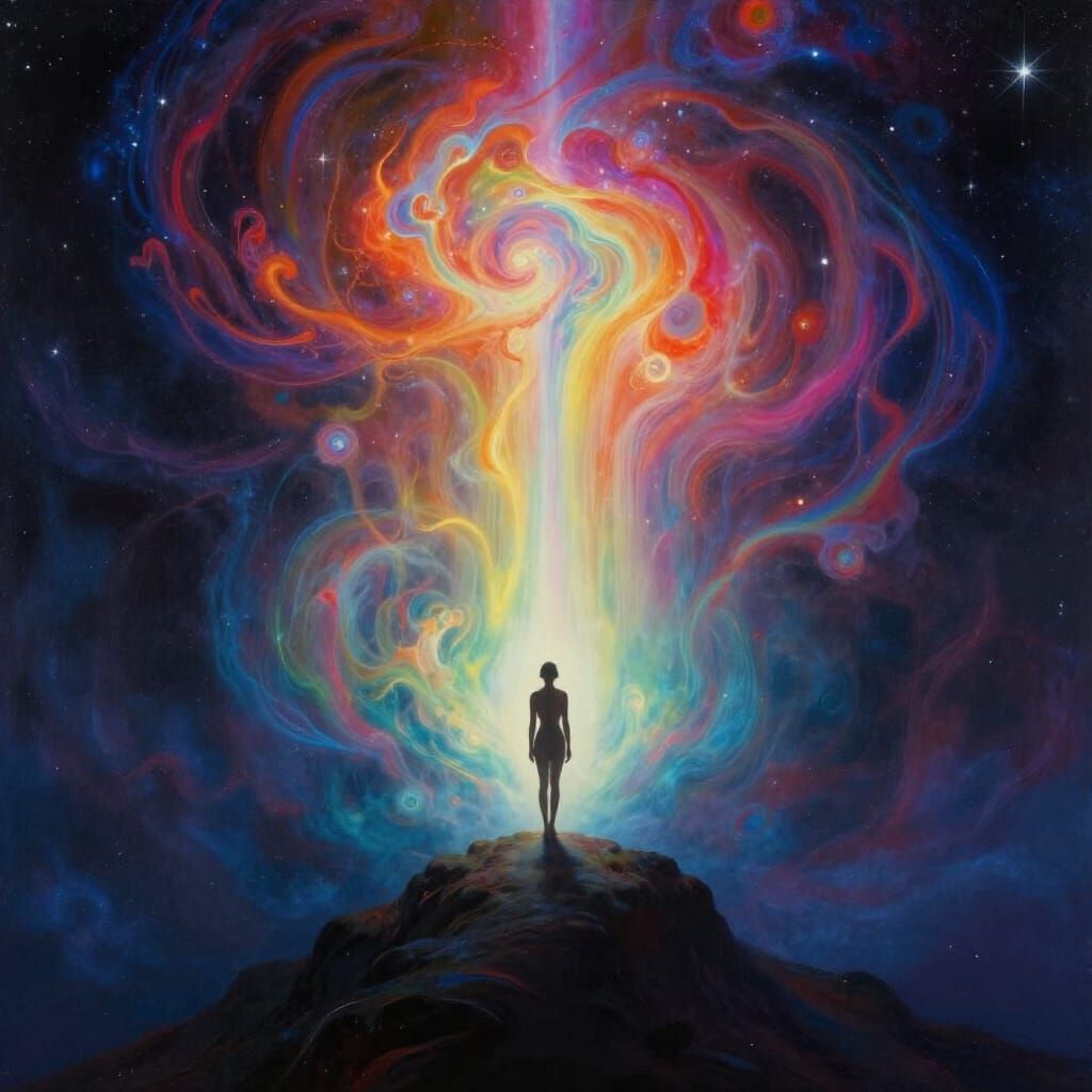 A solitary figure contemplates a vast, cosmic abyss filled with ethereal, multicolored light. This surrealist artwork evokes unconditional love and surrender, featuring dreamlike atmospherics and intense color gradients.