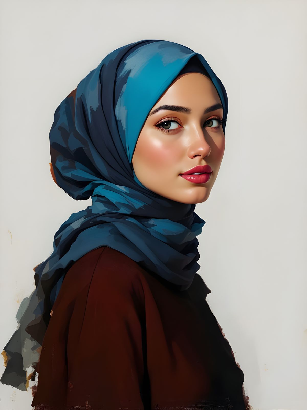 This image shows a beautiful, friendly hijabi woman in a modest turtleneck, rendered as an oil painting with fine brushstrokes, evoking classical artistic techniques.