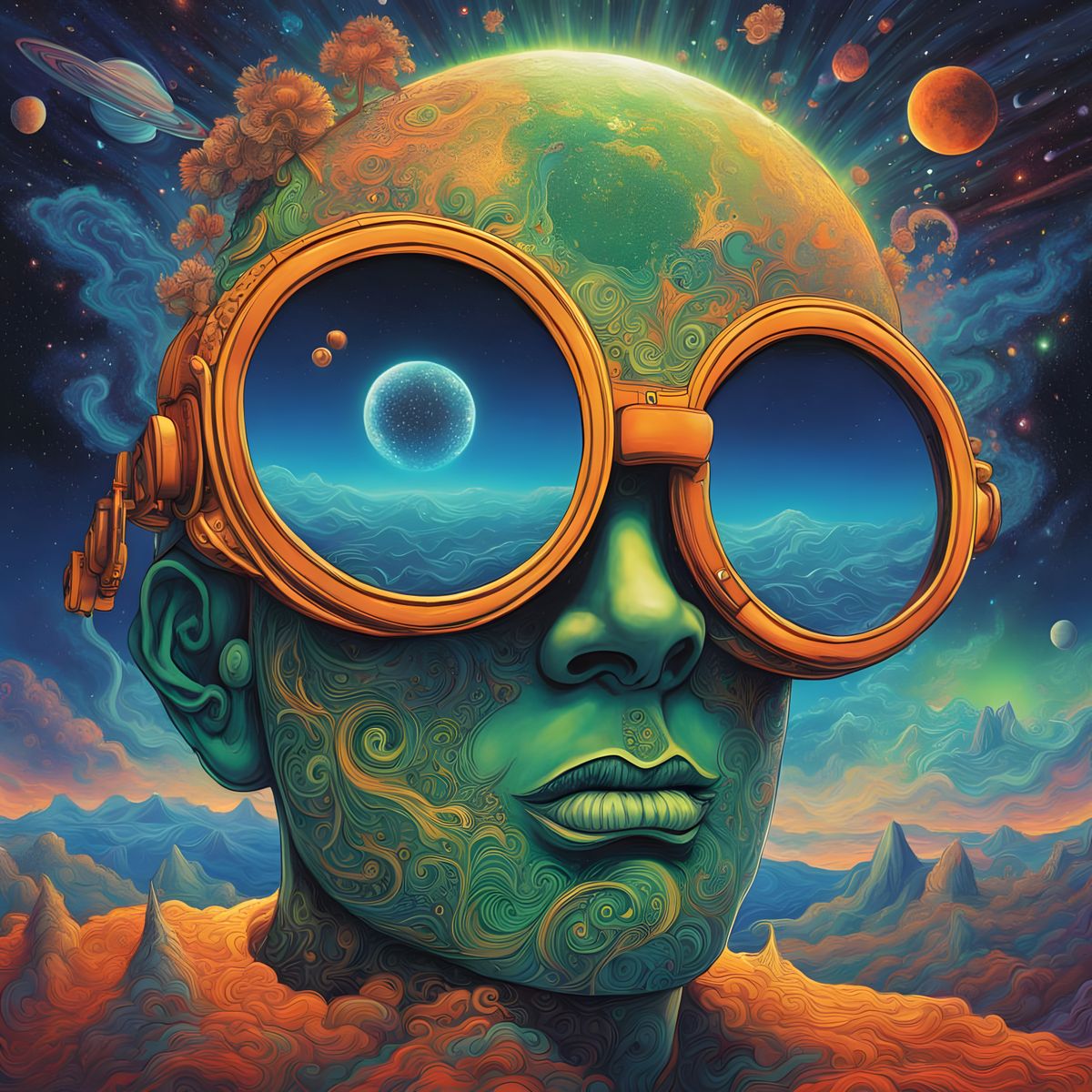 This 8k resolution holographic illustration blends cosmic and astral elements, featuring a dynamic trade between Thunder Goggles and the Luminous Green in a mixed media style.