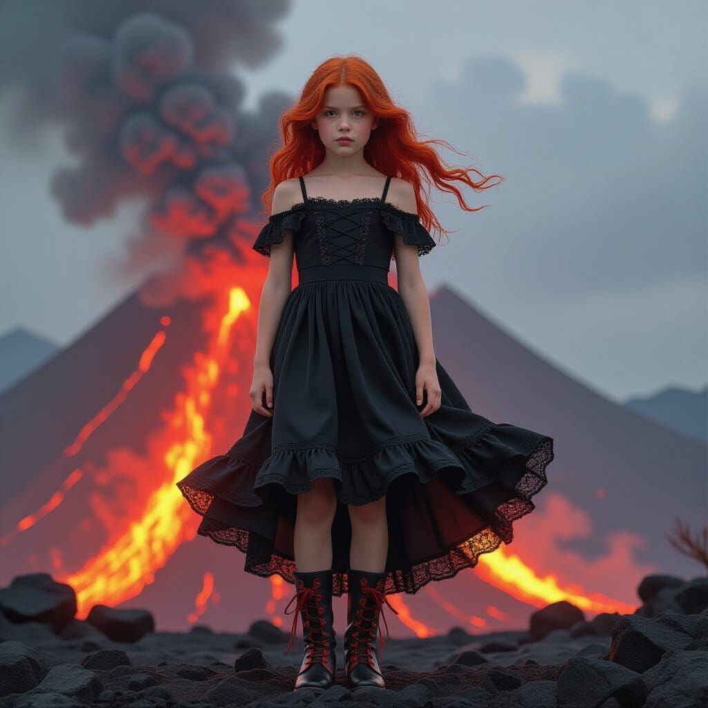 This image shows a red-haired girl in a black dress and boots standing before a volcano. The image is styled with dramatic cinematic lighting and intense colors.