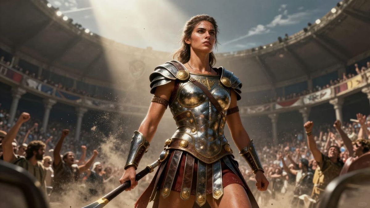 A powerful female gladiator stands victorious in a Roman amphitheater, armor gleaming. Detailed concept art style with dramatic lighting and vivid colors captures her triumphant moment.
