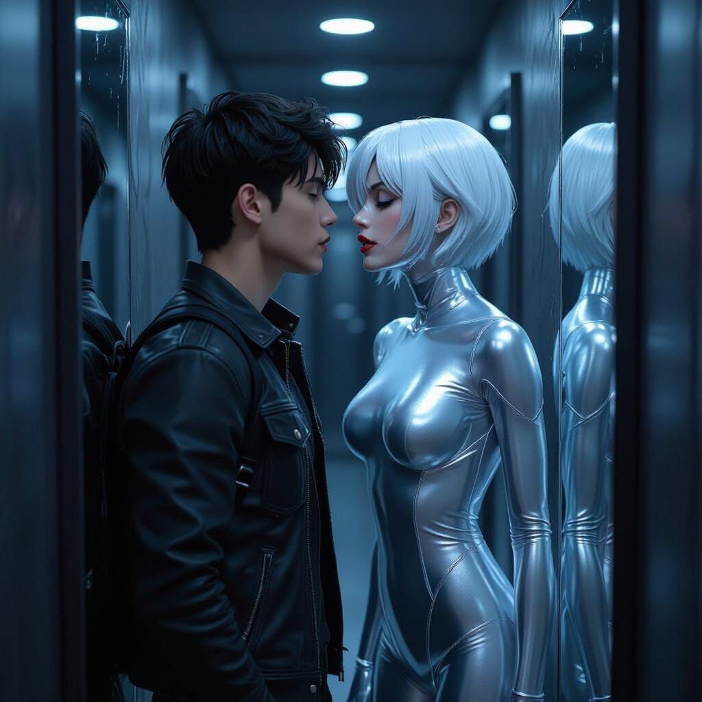 This image shows a surprising kiss between a young man and a woman in a mirrored hallway. The scene is rendered with cinematic lighting and deep colors, in a cel-shaded anime style.