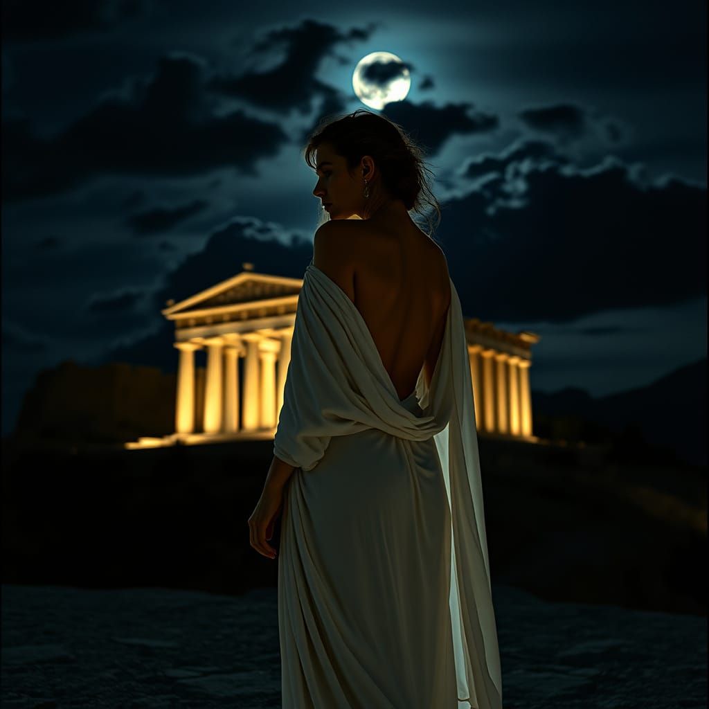A striking picture of a goddess in flowing white robes. Bathed in moonlight, she glances back over her shoulder towards the viewer, set against the dramatic backdrop of the Acropolis, as a cinematic film still.
