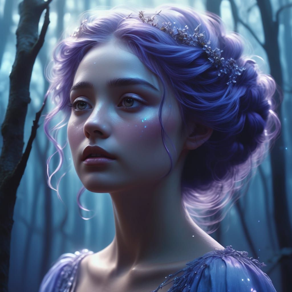 This image shows a woman standing in a dark forest. Ethereal moonlight shimmers in her hair, in a dreamlike digital painting. The soft, vibrant colors create a mystical mood.