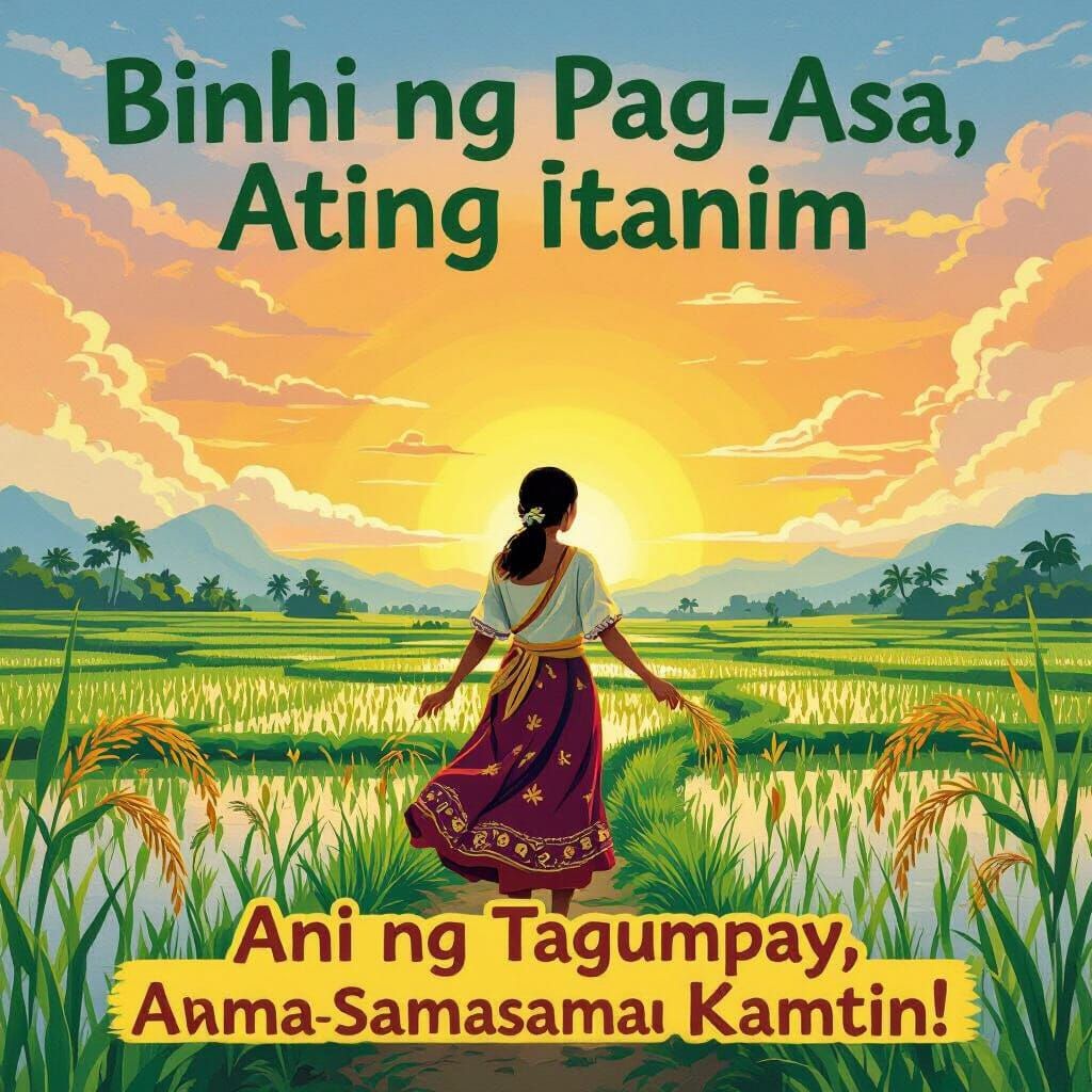 A vibrant illustration of a woman in traditional dress amidst rice paddies at sunrise. The artwork features a whimsical style with colorful fonts emphasizing themes of hope, harvest, and unity.